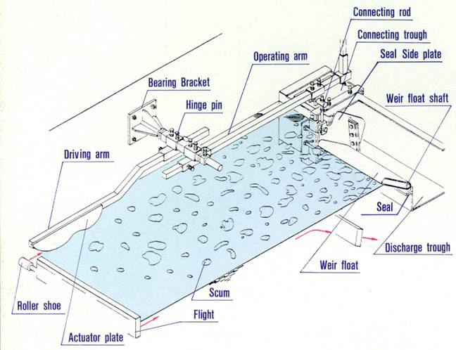 When the roller shoes leave the actuator plate, the weir float begins to collect scum floating on the water surface.